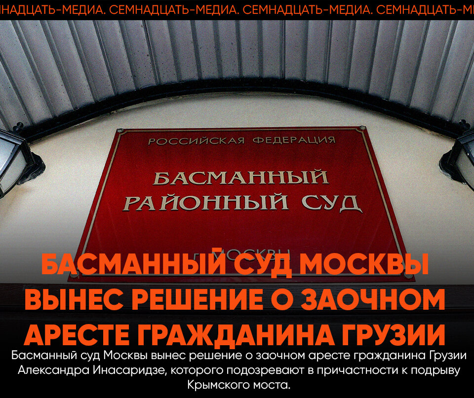 Басманный суд Москвы вынес решение о заочном аресте гражданина Грузии Александра Инасаридзе, которого подозревают в причастности к подрыву Крымского моста.