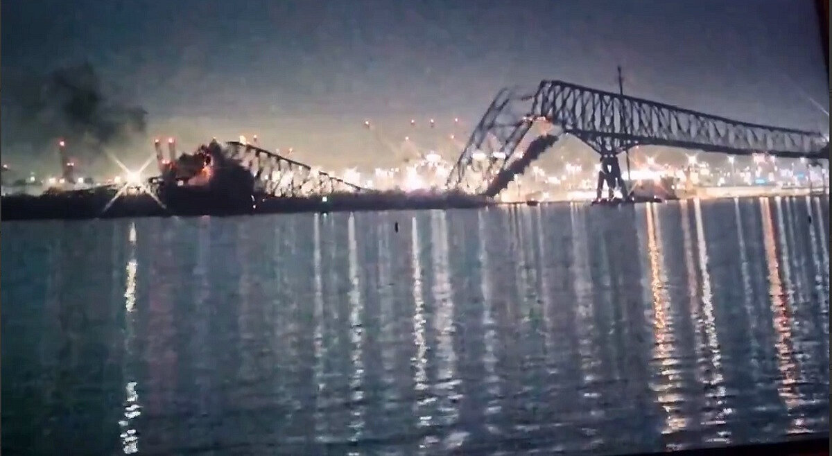 В США обрушился автомобильный мост Фрэнсиса Скотта Ки В Балтиморе, США рухнул четырехполосный мост Фрэнсиса Скотта Ки после того, как в одну из его опор врезался грузовой корабль. Власти заявили о заявили о происшествии с массовыми жертвами, передаёт CNN. Мост через реку Патапско расположен в Балтиморе, штат Мэриленд. Его длина — около 2,5 километров. Согласно данным местных СМИ, которые ссылаются на сообщения береговой охраны, с мостом столкнулось грузовое судно Dali под флагом Сингапура. Сообщается, что в результате обрушения моста в воде могут оказаться более десятка автомобилей и множество людей. Спасатели ищут по меньшей мере 20 человек. Судно, которое врезалось в мост, загорелось, а затем затонуло. На месте ЧП работают аварийно-спасательные службы. ВИДЕО СМОТРИТЕ У НАС В ТГ-КАНАЛАЕ Фото: стоп-кадр из видео Ещё больше новостей на сайте «Изнанка»
