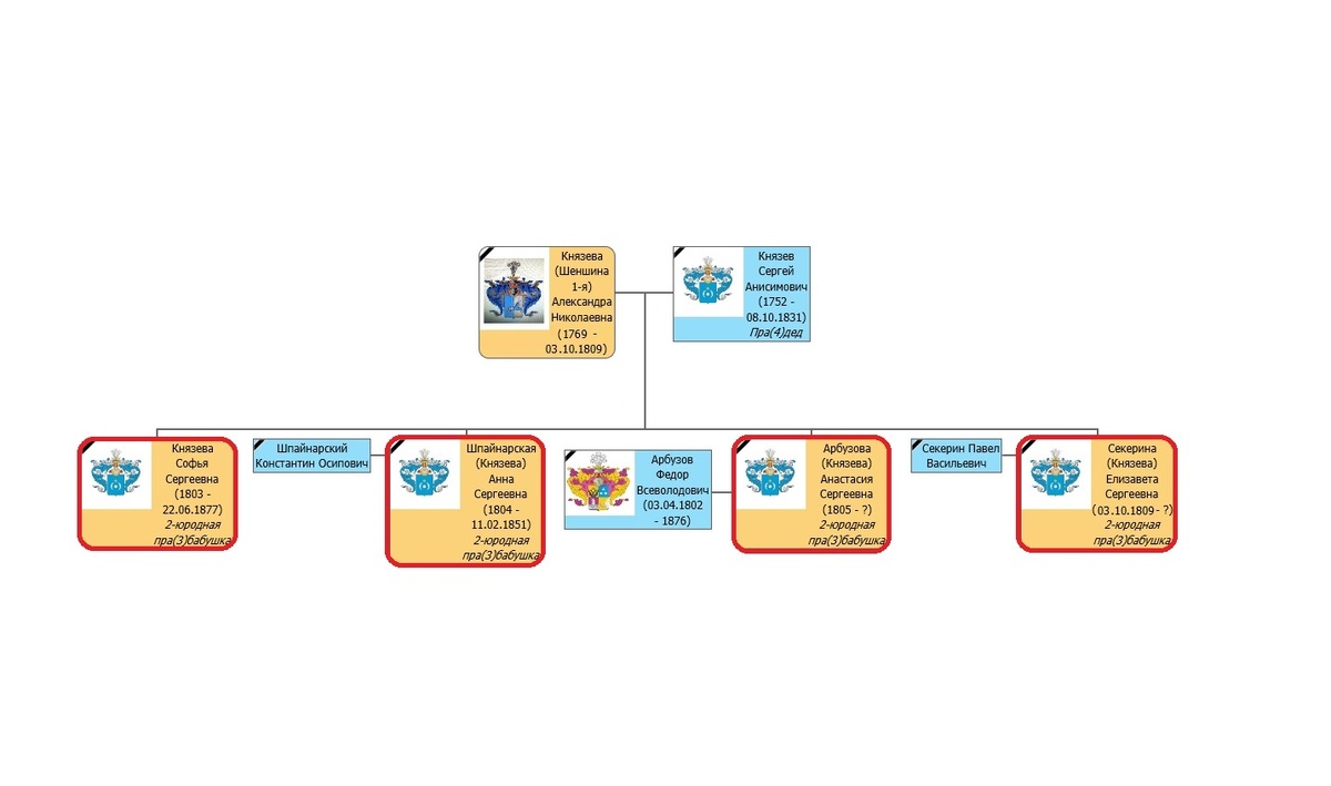 3. Анастасия Сергеевна Арбузова (Князева). Она родилась в 1805 году. Вместе с сестрами и отцом пережила войну и смерть матери, потом росла при мачехе. Но, эта женщина оставила большой след в истории рода Князевых, породнившись с очень древним и именитым родом Арбузовых. Брак этот был богат на потомков, одним из которых является и мой двоюродный дядя Виктор Ильиных. Кроме того, именно дети и внуки Анастасии Сергеевны породнили Князевых с такими родами как князья Львовы, графы Толстые, Желябужские, Зиловы, Крушинские. И наконец, две женщины из этой ветви рода Арбузовых вновь стали Князевыми: внучка Анастасии Сергеевны – Мария Евгеньевна Арбузова, выйдя замуж за своего двоюродного дядю, Валериана Валериановича Князева, и правнучка – Наталья Федоровна Арбузова, став второй женой своего троюродного дяди, Ивана Васильевича Князева, моего прадеда.
