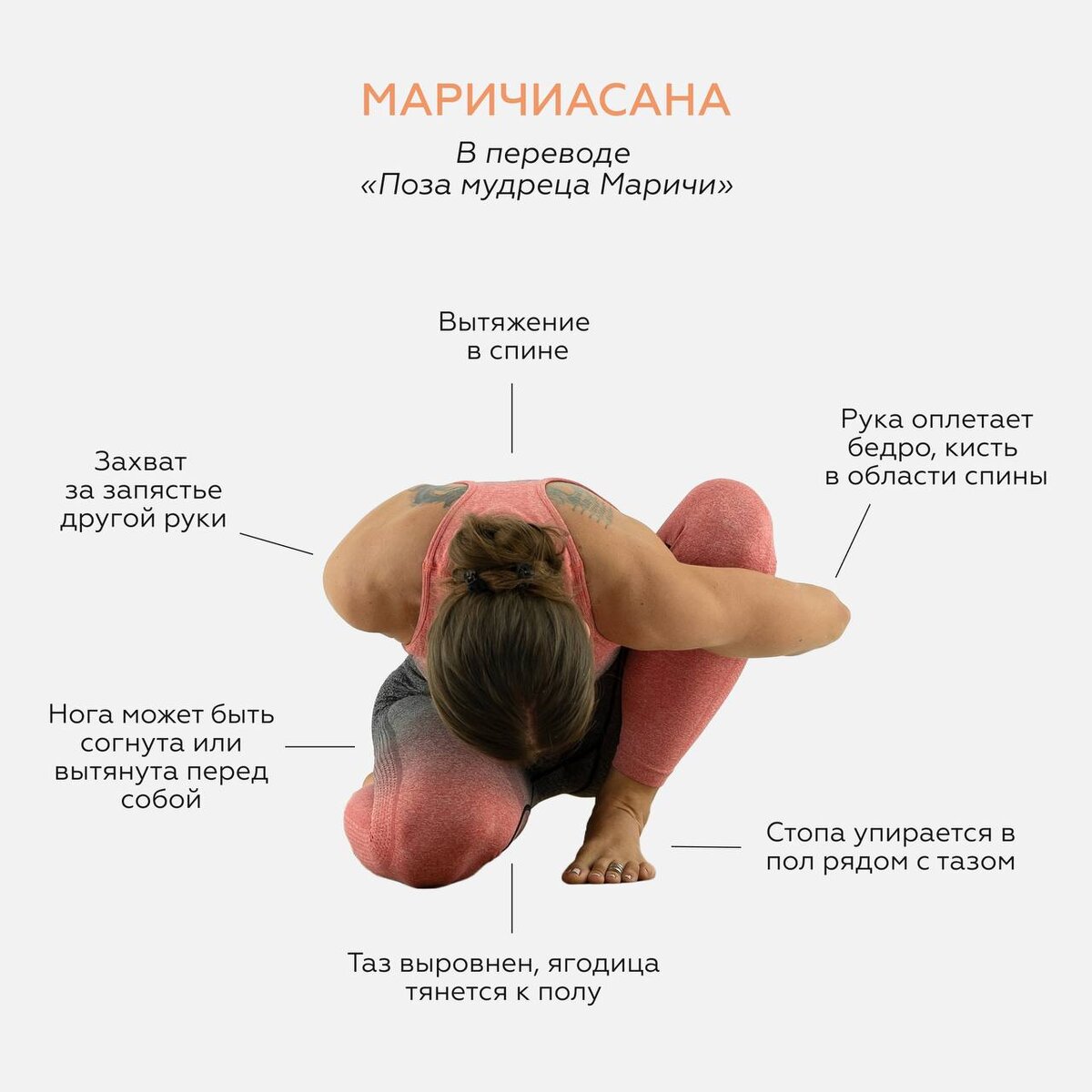 • В Ардха Матсиендрасане, наоборот, нога перекрещивается и происходит приведение бедра. • В Маричиасане вы наблюдаете наклон.