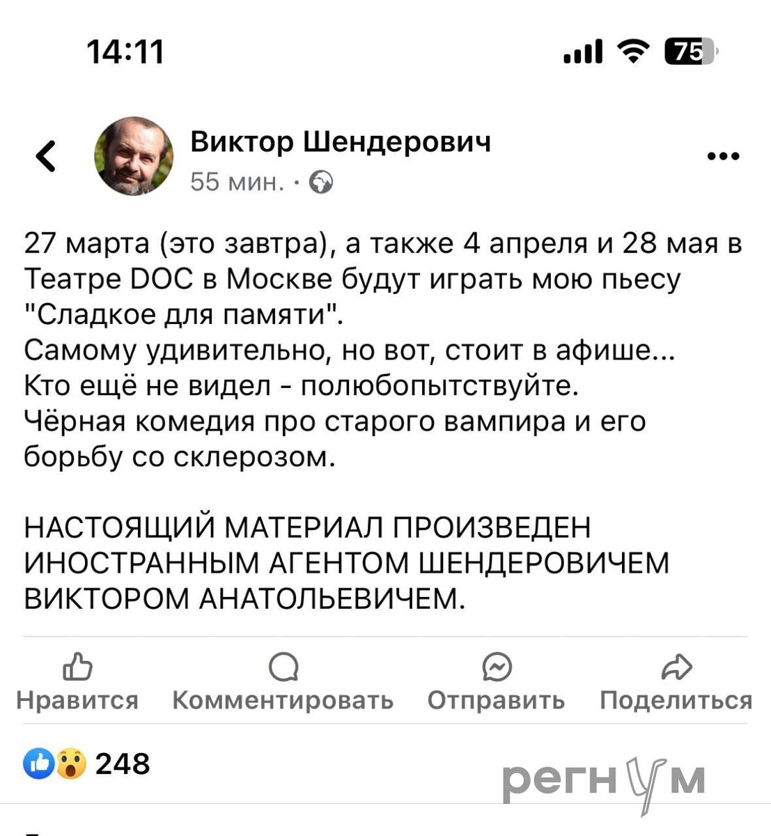 Чёрная комедия про старого вампира и его борьбу со склерозом," - рекламирует столичное представление со своих страниц в социальных сетях иноагент Виктор Шендерович. Пьеса, естественно, политизированная.