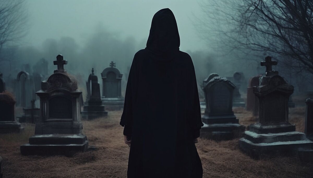 На ней был чёрный балахон с глубоким капюшоном, который скрывал всё тело. Невозможно было разглядеть ни лица, ни рук, ни ног. Оставалась лишь чёрная фигура, которая то стояла, то плавно перемещалась между могил.
