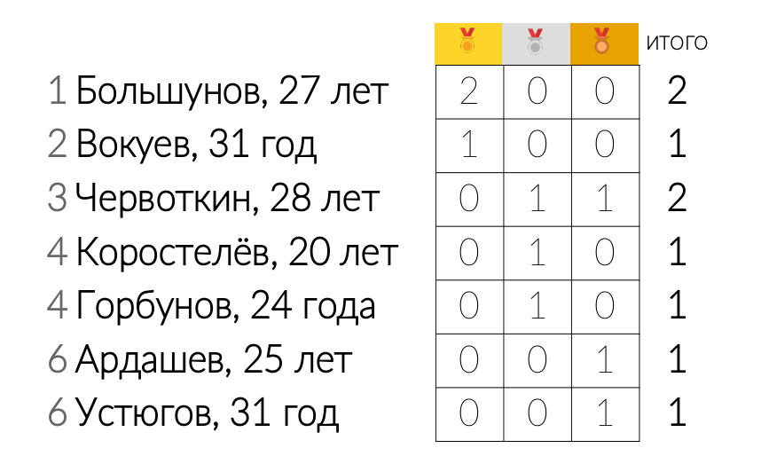 Кстати, у женщин абсолютно аналогичная ситуация, когда 9 медалей распределили 7 спортсменов, получается у двоих по паре медалей.