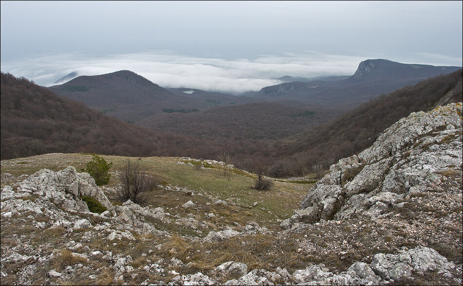Когда углубляешься в яйлу, поражают масштаб и величие окружающего ландшафта. Чувствуешь себя муравьём в этом лунном пейзаже. А ведь это только краешек Бабугана — самая узкая его часть. Пройти бы глубже… Но это уже будет явным нарушением заповедного режима. Да и чтобы поход уложился в один день, начинать подъём надо существенно раньше. Пока же я ограничился видами на Конёк и Чатыр-Даг с восточного края урочища Дипля.