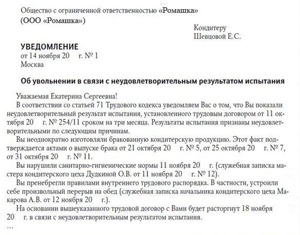 Перед увольнением работодатель должен предупредить работника письменно о расторжении трудового договора и указать причины, по которым он признан не выдержавшим испытание. Данное письменное предупреждение должно быть предъявлено работнику не позднее, чем за 3 дня до расторжения трудового договора.