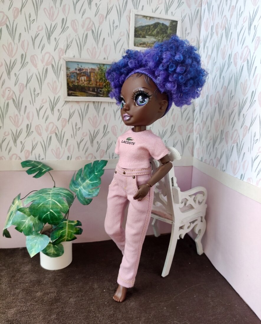 Приветствую всех заглянувших, сегодня речь пойдет про малышек Джуниорок Рейнбоу Хай. Давно хотела заняться разработкой выкроек, чтобы обеспечить свою девочку гардеробом на все случаи жизни, а вас порадовать большим комплектом выкроек. Начать решила с джинсов и майки, т.к. куклы со схожим размером у меня есть и отталкиваться было от чего, но это не значит, что не пришлось отшивать несколько образцов, чтобы получить хоть немного приличный вариант штанишек. Первые джинсы не очень удачно легли на попе ( из-за отсутствия кокетки и соответственно вытачки, которая у куклы, с которой содрала выкройку, была просо не нужна в связи с отсутствием попы) и штанины оказались очень широкими. И если второе было не сложно исправить, то кокетку по попе пришлось отрабатывать уже на других штанах. Первый опытный образец Перед по посадке для первого раза меня вполне устроил, изменения внесла в выкройку, добавила кокетку по попе для лучшего прилегания по талии. Не скажу, что довольна образцом на 100 %, но на