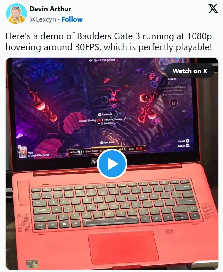 Дэвин Артур в X (ранее Twitter) опубликовал видео, на котором ноутбук с процессором Qualcomm Snapdragon X Elite вполне успешно запускает Baldur's Gate 3 в разрешении 1080p при примерно 30 кадрах в секунду. С перезаливом видео на YouTube вы можете ознакомиться по ссылке. Ранее, напомним, нам сообщили, что Snapdragon X Elite будут без каких-либо проблем работать с Windows-играми, которые созданы для x86-процессоров. При этом заявляется, что графика этих процессоров полноценно поддерживает DirectX 11/12, Vulkan и OpenCL через драйвер напрямую, а также имеет какую-то форму обратной совместимости с DirectX 9 и OpenGL 4.6.