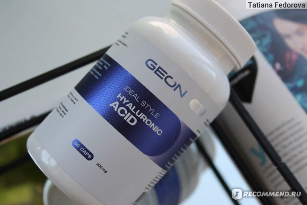 Всем привет Если вы настороженно относитесь к различным БАДам и добавкам, то я точно знаю, что можно принимать безо всяких опасений. Это гиалуроновая кислота! Особенно она актуальна тем, кто уже перешагнул возраст 30 лет, ведь уже даже ранее в нашем организме снижается уровень вырабатываемой гиалуронки нашим организмом.... GEON IDEAL STYLE Hyaluronic Acid Упаковка Добавка находится в стандартной баночке. Кстати, она изготовлена из пластика и имеет очень высокое качество. Сама баночка белого цвета, а наклейка, которая нанесена поверх нее, имеет сочетание синего и белого оттенков. На этикетке имеется необходимая информация. Дополнительной коробки на гиалуронке не было. Баночка закрывается при помощи винтовой крышки, она тоже пластмассовая, но выполнена из менее плотного материала. Закрывается легко и открывается тоже. Защиты от детского "проникновения" не было. Под основной крышкой изначально находилась защитная пленка из фольги. Я ее удалила. Состав 60 капсул