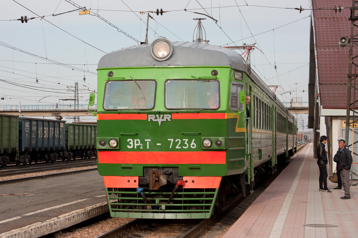 Утром 2 мая 2015 года пассажирский поезд остановился на станции Петропавловск, расположенной на территории Казахстана, и из него, помимо остальных пассажиров вывалились три наши туши. И пока обычные пассажиры буднично толпой пошли к выходу, мы втроём уже щёлкали затворами рядом с потрясающей красоты зелёной электричкой ЭР2Т-7236, которая была окрашена в фирменные цвета Южно-Уральской железной дороги... И как такое можно было променять на красно-серый корпоратив?!