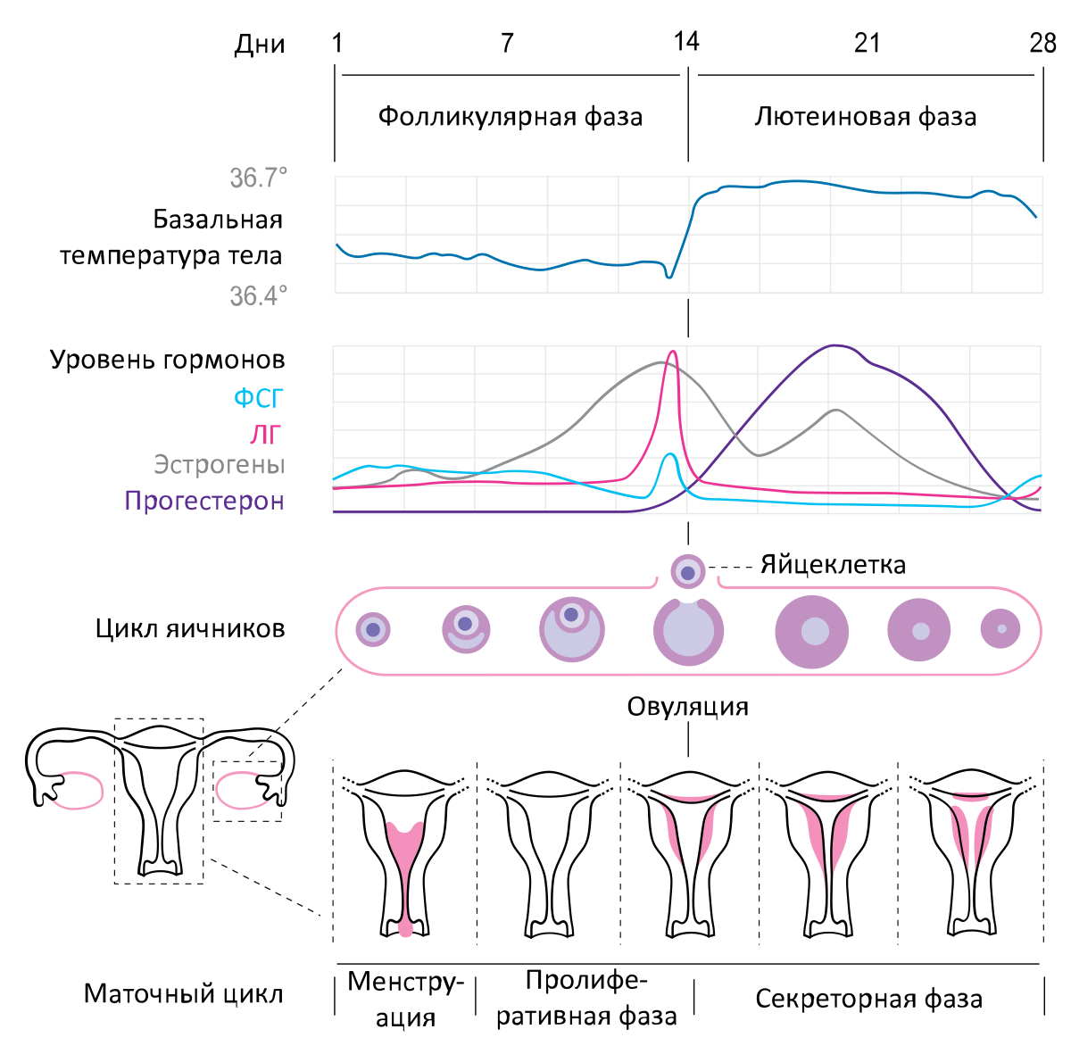 Женский организм вырабатывает множество гормонов, связанных с менструальным циклом, беременностью и лактацией. Их выработка происходит в мозге и в яичниках. Некоторые гормоны вырабатываются в значительных количествах, потому что им нужно перемещаться по телу и воздействовать на органы, например, матку и мозг. Других вырабатывается немного и они действуют локально. В разных фазах цикла действуют разные гормоны. Фолликулостимулирующий гормон Синтезируется в передней доле гипофиза, запускает процесс образования и формирования яйцеклетки в яичниках. Перед овуляцией достигает максимального уровня. Анализ крови на ФСГ - один из главных для оценки репродуктивного здоровья женщины. Лютеинизирующий гормон Также вырабатывается в гипофизе, стимулирует выработку прогестерона и образование желтого тела. Его высокий уровень говорит о преждевременной менопаузе и недостаточной функции яичников. Эстрадиол Это главный женский гормон. Он вырабатывается в яичниках развивающимся фолликулом. Его уровень зна