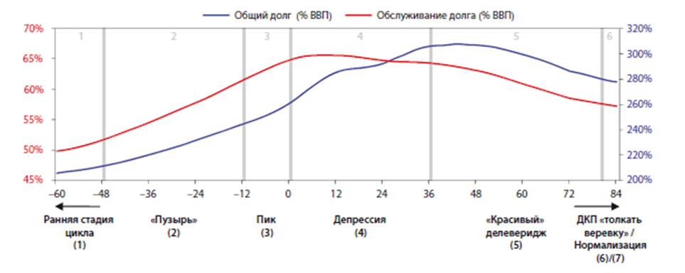 На следующем графике представлены семь этапов архетипа долгосрочного кредитного цикла, в которых суммарный долг в экономике рассматривается как процент от общего дохода экономики (ВВП) и общей суммы платежей по долговым обязательствам по отношению к ВВП на протяжении 12 лет. Ранний этап цикла На раннем этапе цикла долг не растет быстрее доходов, хотя он устойчив. Так происходит потому, что рост долга используется для финансирования деятельности, дающей быстрый рост дохода. Например, заемные деньги могут быть использованы для расширения бизнеса и улучшения производства, что обеспечивает компаниям рост прибыли. Долговое бремя на этом этапе незначительное, а балансы в хорошем состоянии, поэтому у частного сектора, государства и банков предостаточно возможностей для привлечения заемных средств. Рост долга, экономический рост и инфляция находятся на не слишком высоком и не слишком низком уровне, а «в самую пору». «Пузырь» На этапе назревания «пузыря» долги растут быстрее доходов, что обеспе