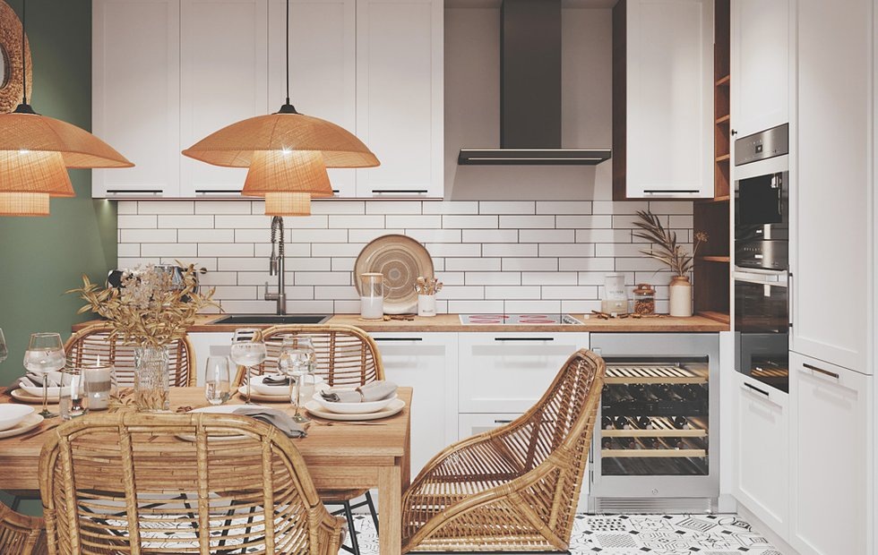 Заказчики проекта — молодая пара любителей катания на досках (сноуборд, серфинг). Они познакомились и влюбились на острове Бали, поэтому попросили дизайнеров из студии KS Interiors создать похожий интерьер в московской квартире. Ключевыми акцентами стали: обилие натурального дерева в материалах, глубокий зеленый цвет стен и декор в стиле бохо, который сейчас часто ассоциируется с Бали, так как там продается много мебели и аксессуаров в этом стиле.