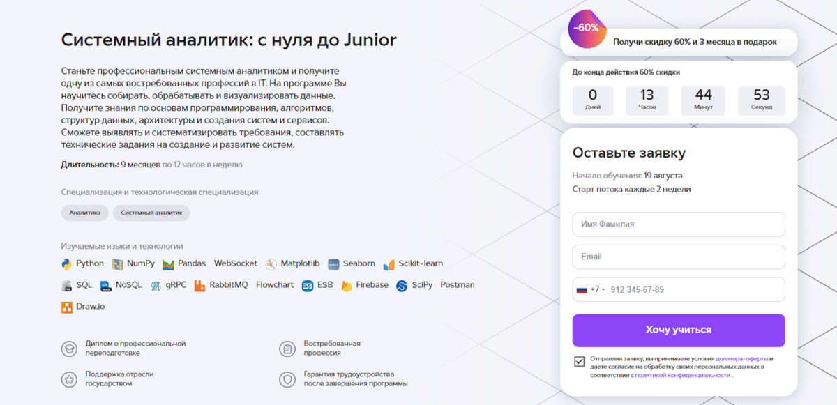 - Особенности: помощь с трудоустройством, курс про системную и бизнес аналитику, гибкий формат обучения, учебная программа составляется ведущими ИТ-экспертами.