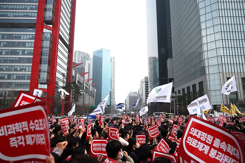Из-за дефицита врачей Южная Корея столкнулась с серьёзной проблемой в области здравоохранения, особенно сильно страдают отдалённые от крупных городов поселения. Правительство решило увеличить количество мест в медицинских учебных заведениях в попытке решить эту проблему. Однако это решение вызвало протесты со стороны врачей, которые опасаются, что увеличение числа медицинских студентов может негативно отразиться на качестве медицинской помощи и условиях труда. Почти все 13 000 врачей-стажеров Южной Кореи, играющих ключевую роль в оказании неотложной медицинской помощи и проведении операций, перестали выходить на работу примерно с 20 февраля. На этой неделе акция расширилась, так как профессора медицины, многие из которых занимаются лечением пациентов, начали подавать в отставку в поддержку забастовки. Президент Юн Сук Ёль призвал к переговорам и предложил гибкий подход урегулированию конфликта, однако стороны пока не пришли к единому решению. Группа, представляющая профессоров медицины