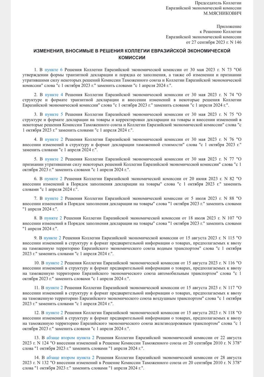 Изначально предполагалось, что все эти документы вступят в силу с 1 октября 2023 года. Однако, согласно решению Коллегии Евразийской экономической комиссии от 27.09.2023 №146 "О внесении изменений в некоторые решения Коллегии ЕЭК", сроки по ряду решений или их отдельных пунктов были перенесены на 1 апреля 2024 года по указанным причинам.
