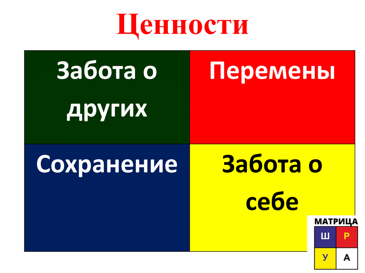 Лично для меня приоритеты ценностей расположены в следующем порядке – а) забота о себе (в самолете маску сначала себе, потом ребенку), б) забота о других, в) сохранение, г) перемены. И это несмотря на то, что я являюсь приверженцем перемен. А как вы думаете?