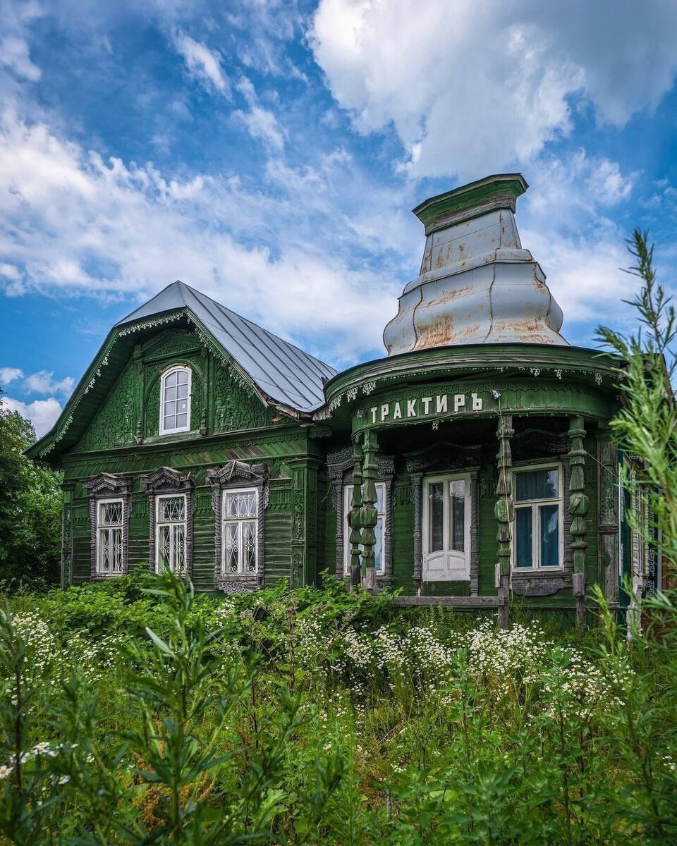Дом прямоугольный под вальмовой крышей с двумя боковыми ризалитами, завершёнными большими килевидными щипцами. С юга и севера - два крыльца, из коих первое явно парадное, а второе - чёрное (судя по богатству и бедности их декора). Главная ось отмечена относительно небольшим треугольным фронтоном. Здание украшено шикарной резьбой, возможно самой богатой и изысканной в Калязинском районе... Дом братьев Виноградовых в с. Поречье, Калязинский район, Тверская область.