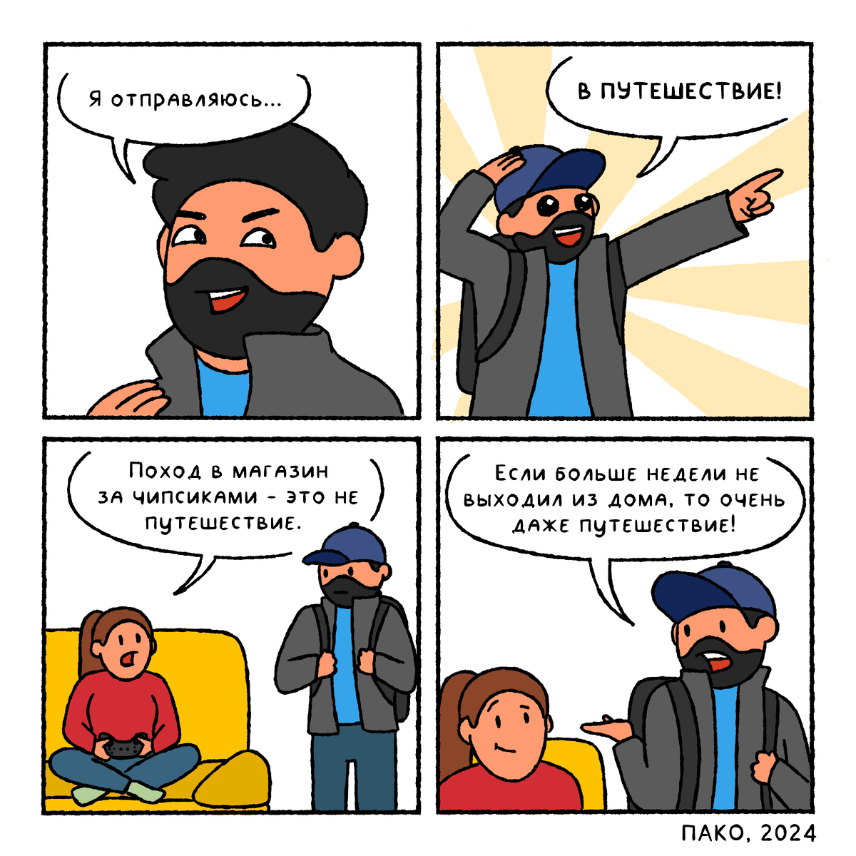 Первый комикс в этой подборке я рисовал специально для конкурса #ВокругСмеха, который был устроен сайтом Пикабу. По условиям нужно было поделиться какой-нибудь забавной историей из путешествия. Но так как я давненько никуда не ездил, пришлось как-то выкручиваться.