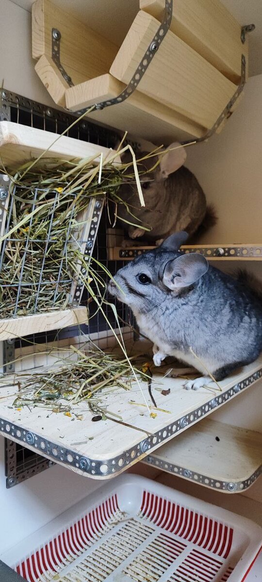 Изначально у меня были две шиншиллы, оба мальчики, которые жили в просторной двухэтажной витрине. И так бы мы жили-не тужили, если бы однажды не пошли с моей дочкой в кафе. Посидели, поели, а на выходе уже увидели ржавую клетку, а в ней, тесно прижавшись друг к другу сидела грустная и грязная пара шиншилл. Не было у них ни домика, ни нормальных полок, ни колеса. Корм, конечно, "мешанка". И всюду поверхности из прутьев, то есть животным даже поспать на боку, укрыться от людей и яркого света было негде. Я решила разобраться. Долго искала администратора, предлагала помощь с обустройством жилья, покупкой корма. Они обещали все исправить, но так ничего и не сделали. Спустя время я увидела этих шиншилл все в том же плачевном состоянии на сайте объявлений. Тут же поехала и забрала. Теперь эти малыши живут со мной. Мои первенцы на первом этаже, а новобранцы - на втором. Ни на минуту не пожалела, что взяла их. Оказались ласковыми, ручными, как котята. В общем, живем дружно. И все довольны. Помо