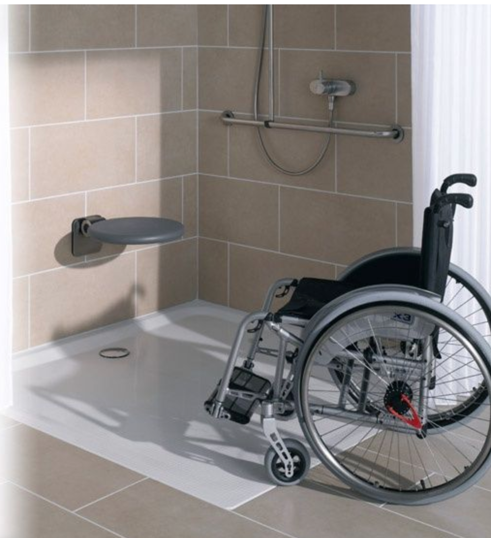 К сожалению, малоподвижным людям бывает трудно пользоваться ванными и по этой причине отличным решением будет душевая перегородка из стекла. Необходимые элементы: Чтобы человеку было удобно, стоит учесть наличие сидения и (или) возможность заезда вовнутрь душевой инвалидной коляски. Пол в душевой должен быть по-возможности ровным (но не забываем о наличии уклона для слива воды), чтобы была возможность проезда коляски и просто не создавать лишних препятствий, обо что можно споткнуться. В идеале стоит выбрать дверцы шириной от 70 см, чтобы стандартная коляска 62 см могла без проблем проехать в помещение душевой. Стоит обратить внимание на дверцы, открывающиеся в обе стороны, чтобы толкнув коляской, легко проехать в помещение, затем так же легко выехать из него. Предусмотреть низко закрепленный в идеале регулирующийся душ. Предусмотреть ручки-поручни для удобства. Если душевой будет пользоваться только инвалид сидя, для удобства эксплуатации можно выбрать низкое душевое ограждение до
