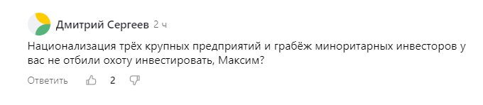 Гиганты же, как Сбер, Газпром и Лукойл, по велению Кремля заморозившие дивиденды иностранным акционерам - это тоже не национализация, а вполне адекватный ответ на заморозку наших активов.
