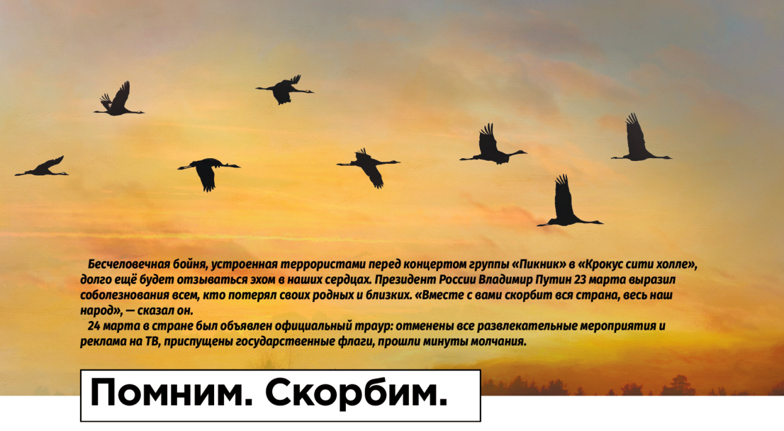Бесчеловечная бойня, устроенная террористами перед концертом группы «Пикник» в «Крокус сити холле», долго ещё будет отзываться эхом в наших сердцах. Президент России Владимир Путин 23 марта выразил соболезнования всем, кто потерял своих родных и близких. «Вместе с вами скорбит вся страна, весь наш народ», — сказал он.