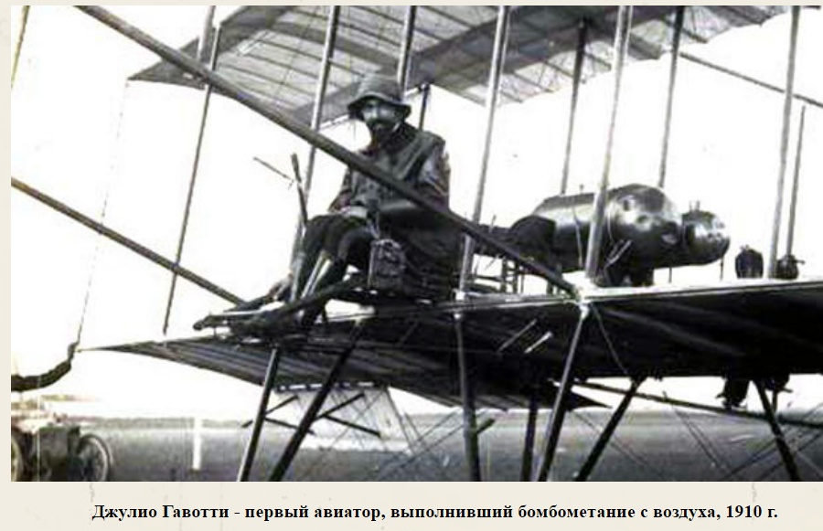 Разумеется турецким солдатам летющая над головами "птичка" не нравилась, а потому по ней начали стрелять, благо летали в то в ремя не высоко и не очень быстро, а сам аэроплан состоял из тряпок, дерева да фанеры. Азарта и гнева стрелкам добавило и то, что итальянцы уже не просто тарахтели в небе, но и начали швырять всяческие вредные предметы на головы пехотинцев. Так, уже в ноябре 1911 Джулио Гавотти , сбросил 15 килограммовую бомбу на турецкую кавалерию. И, хотя, первые бомбардировки были не очень успешными в материальном плане, они весьма сильно влияли на, моральный дух противника.