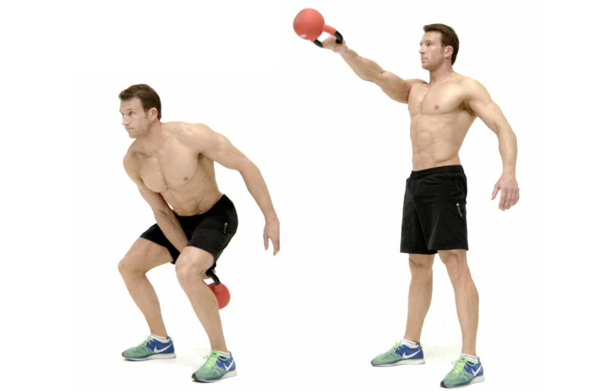- Сожмите ягодичные мышцы, выдвиньте бедра вперед и поднимите гирю вверх. Размахивайте другой рукой, чтобы увеличить импульс.