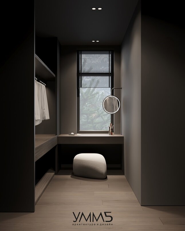 Также из спальни можно попасть в отдельный гардероб для хозяев с большим количеством систем хранений вещей, это помогло не нагружать интерьер дополнительными шкафами.