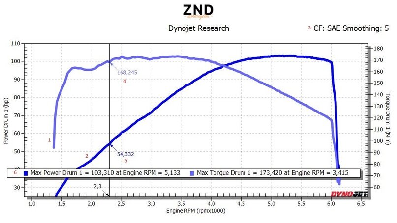 а) мощность на колесе - т.е. с учетом потерь в трансмиссии; б) мощность на маховике двигателя т.е. без учета потерь. Этот тип мощности на всех колесных стендах является расчетным и не может быть 100% достоверным. Мы используем в своих графиках мощность на колесе. Обычно для демонстрации максимальных возможностей мотора естественно используется полностью открытый дроссель с отсутствующей нагрузкой. Рассмотрим график ниже. По оси X - обороты двигателя, по оси Y (слева) - мощность в л.с., Y (справа) - крутящий момент. Цифра 1 - кривая крутящего момента; цифра 2 - кривая мощности; цифра 3 - стандарт измерения мощности и степень сглаживания (5); цифра 4 - значение крутящего момента в выделенной т