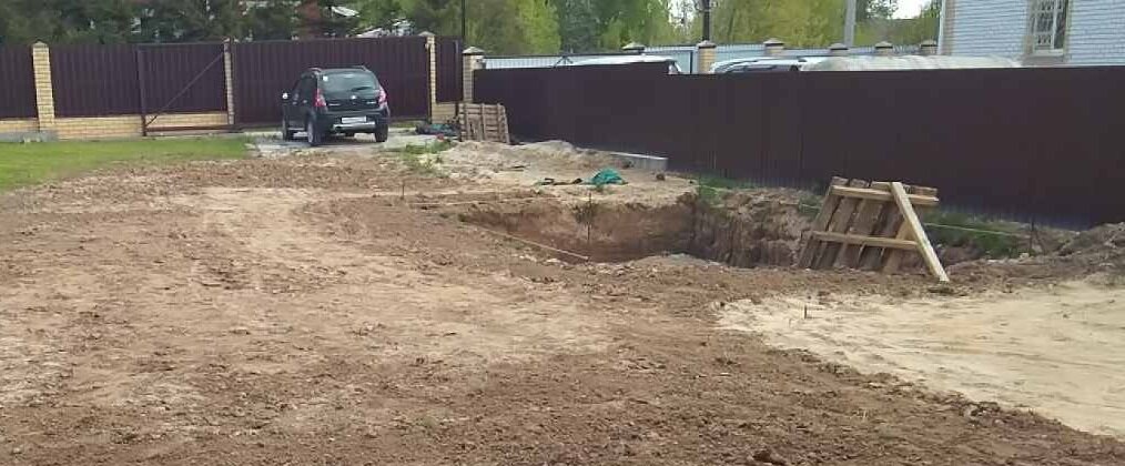 В итоге трактор вкопал котлован порядка 1.1-1.2 м глубиной, я выровнил дно. Трактор мне спустил в котлован виброплиту (потом вытащил ковшом), я утрамбовал дно, расстелил геоткань. Далее трактор навозил в котлован песка, разровнял выкопанную землю и уехал.