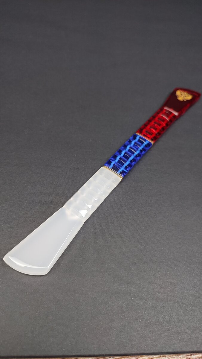 Первая треть четок занимает молочный цвет, как символ белой полосы на флаге России. Затем следует сапфировая треть, которая напоминает синий цвет флага, а завершает композицию рубиновая треть, представляющая красную полосу.