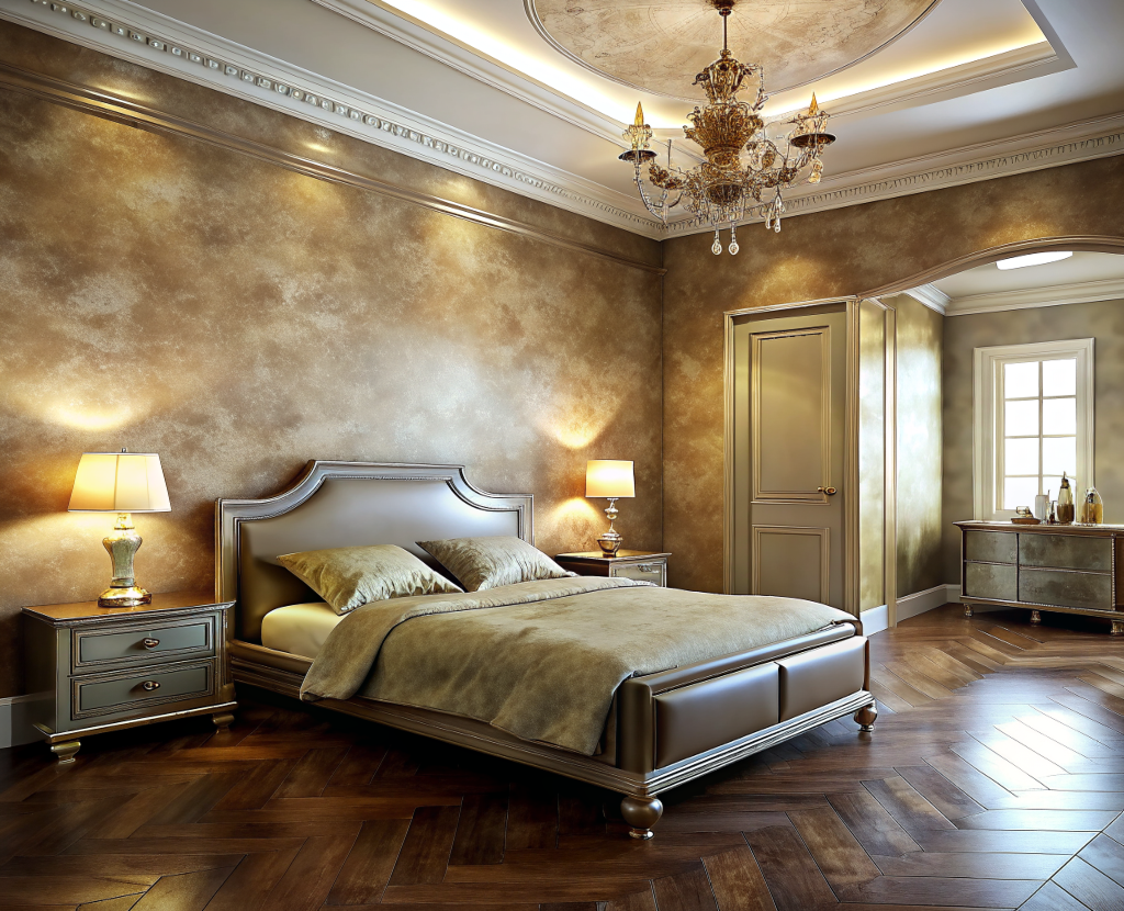 Венецианская штукатурка - это один из самых популярных видов декоративной штукатурки. Она характеризуется гладкой, зеркальной поверхностью, которая создает эффект воды. Венецианская штукатурка идеально подходит для спален в классическом или современном стиле.