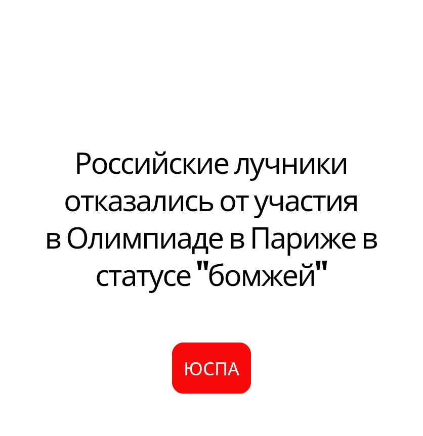 После слов руководителя Федерации художественной гимнастики Ирины Винер российские лучники отказались от участия в парижской Олимпиаде в статусе бомжей. Напомним, что руководитель Федерации гимнастики Ирина Винер сказала, что поехавшие на Олимпиаду от России спортсмены будут в "командой бомжей без флага и гимна". 🦾 ЮСПА