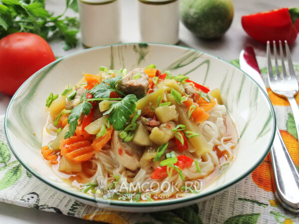 1. Обжарьте мясо на сковороде с маслом или сразу в толстостенной кастрюле. 2. Затем положите к мясу нарезанные овощи (перец, редьку, баклажан и лук) и обжаривайте в течение 5-6 минут. 3. После влейте воду (ориентировочно 400-500 мл). Количество воды можно влить и меньше, если хотите, чтобы получилось погуще. Всыпьте соль, перец и специи. Варите лагман под крышкой до готовности (примерно 25-30 минут). За 5-7 минут до