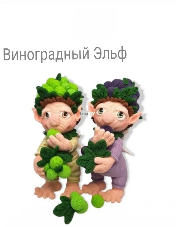 Я связала эльфа крючком в двух цветовых вариантах. Ведь виноград бывает зеленый и фиолетовый, вы можете выбрать, какой вариант цвета вам больше нравится. Я всегда указываю материал 50 грамм. Вы также можете использовать другие цвета.