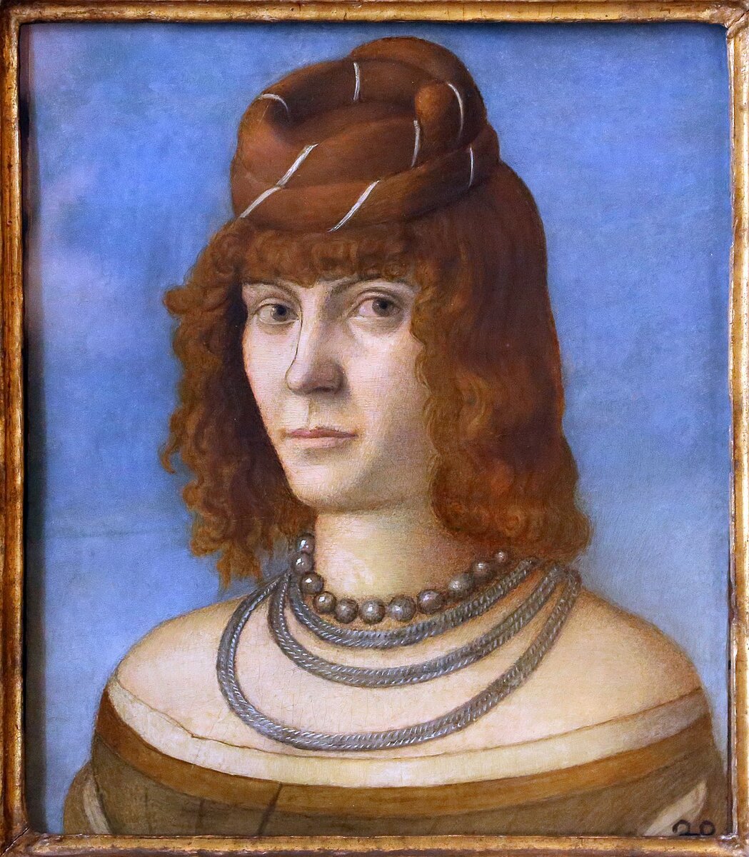 Встретила в сети вот этот странный портрет. Странен он, прежде всего прической изображенной дамы. Какой-то крендель на макушке, который придает женщине удивительно плебейский вид. Впечатление, что проснулась, накрутила сама себе макушку как вышло - и пошла художнику позировать. А между тем у дамы на шее серебряные цепи в палец толщиной в три ряда и жемчужное ожерелье. То есть ко встрече с мастером она хорошо подготовилась. Украсила себя. Сперва была мысль, что это некий художник-иллюстратор наших дней изобразил средневековую сеньору в стиле "я так вижу". Однако выяснилось, что портрету уже много веков. Он датируется концом 15-началом 16 веков и висит в серьезном месте - в Галерее Боргезе, в Риме. Дама носит прическу, которую я нашла еще на нескольких портретах той эпохи: Вот Портрет неизвестной, который датируется теми же годами, и приписывается кисти итальянского художника Джакометто Венециано (1472-1497 гг.): Вроде все то же самое на месте - и челочка, и короткие кудри по сторонам ли