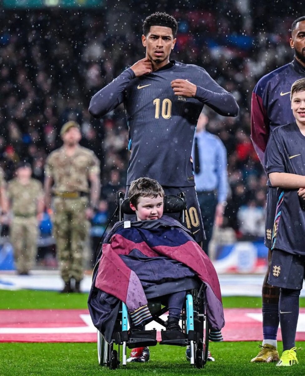 Доброе сердце Джуда. Перед матчем с Бельгией Беллингем укутал в свою куртку маленького маскота с инвалидностью, чтобы укрыть от дождя