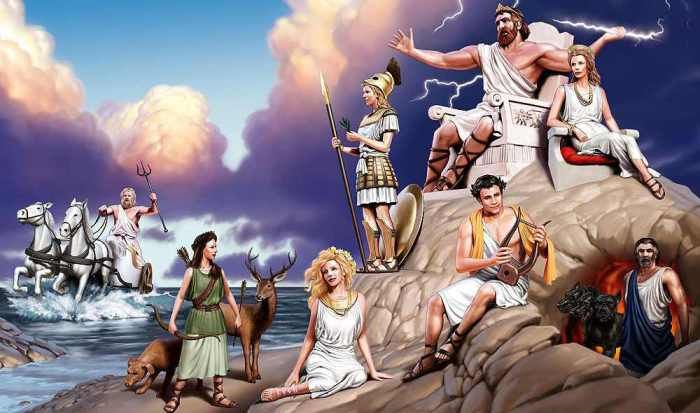 В древнегреческой мифологии особо почитались двенадцать богов, обитателей Олимпа. Это Аполлон, Арес, Артемида, Афина, Афродита, Гера, Гестия/Дионис, Гермес, Гефест, Деметра, Зевс, Посейдон. Некоторыми из этих имен до сих пор называют людей. Таковы Аполлон, Афина, Афродита и Гера. Дионисий сократилось и теперь произносится Денис. Это настолько древние имена, что установить их этимологию в настоящее время невозможно. Есть целый ряд имен, имеющих косвенное отношение к перечисленным богам. Зиновий – «посвященный Зевсу», как и Зинаида. Аполлинария – «посвященная Аполлону». Артем – «посвященный Артемиде». Дмитрий – «посвященный Деметре». Геракл Ираклий – «Гера» + «слава». Герасим с древнегреческого переводится «почтенный» и прямого отношения к Гере не имеет. Есть ряд имен древнегерманского происхождения, включающих схожий по звучанию элемент. Геральд – «копье» + «владеть». Герберт – «войско» + «блестящий». Герхард – «копье» + «сильный». Гермион – «изгнанник». Гермиона соответственно «изгнанн