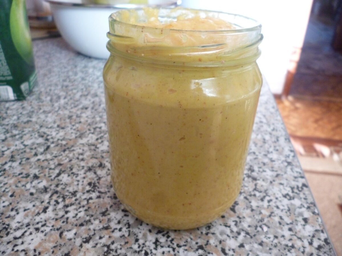 Ингредиенты: яблоки-500 г; специи- перец, паприка,куркума;перец красный- по 1/4 чайной ложки; горчица- 1 столовая ложка; растительное масло-200 г; сахар-1 столовая ложка; соль-1 чайная ложка; лимонная кислота-1/4 чайной ложки( можно меньше или больше, зависит от сладости яблок) У меня кисло-сладкие яблоки. Яблоки помыть Почистить, удалить сердцевину Сложить в пакет для пищевых продуктов, пакет завязать, сделать проколы в 2-3х местах и поместить в микроволновку на 5 мин( все зависит от мощности микроволновки). Яблоки должны стать мягкими. Теперь их нужно превратить в пюре любым способом. Я это сделала миксером. Добавить в яблоки все специи, соль, сахар, растительное масло, лимонную кислоту Миксером перемешать до однородной массы. Употреблять можно с любыми мясными, рыбными блюдами, добавлять в салаты или просто намазывать на хлеб. Приятного аппетита!