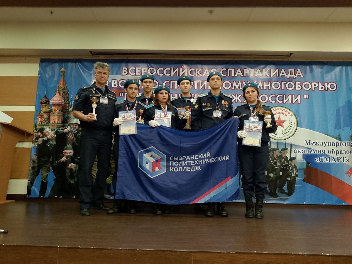 В марте 2024 года в Москве прошла ежегодная Всероссийская военно-спортивная спартакиада «Служу России: Призывник-2024». В финал этих соревнований вышли 6 студентов Сызранского политехнического колледжа: Миронова Татьяна, Суворова Василиса, Беляев Максим, Лобяк Павел, Тимушев Айрат и Алиев Борис. Всего в соревнованиях приняли участие 62 команды со всей России, около 600 участников. Все участники должны были выполнить 7 нормативов: подтягивание, стрельба из винтовки с 10 метров стоя, отжимание, прыжки со скакалкой за 30 секунд, бег на 60 метров, сборка и разборка автомата АК-74 и снаряжение патронами магазина к АК-74. Студенты показали отличные результаты и завоевали 4 призовых места. Суворова Василиса заняла 2-е место в отжимании и 3-е место в сборке и разборке автомата АК-74, в стрельбе из пневматической винтовки 3-е место занял Беляев Максим, а в прыжках в длину с места 2-е место занял Лобяк Павел. Поздравляем всех призеров и участников с победой в соревнованиях, желаем новых успехов