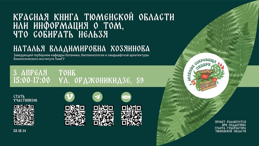 Следующая в цикле лекция «Красная Книга Тюменской области или информация о том, что собирать нельзя» пройдёт уже 3 апреля. Её спикером станет кандидат биологических наук, заведующая гербарием кафедры ботаники, биотехнологии и ландшафтной архитектуры Биологического института ТюмГУ Наталья Владимировна Хозяинова. Наталья Владимировна участвовала в десятках научных экспедиций по всей области, от лесостепи до тундры, собирая сведения о новых и редких для региона видах растений. Благодаря своим знаниям и опыту она выступила соавтором многих книг и научных работ о растительном мире тюменского региона. Теперь она поделится своими знаниями со слушателями «Зеленых сокровищ Сибири»!