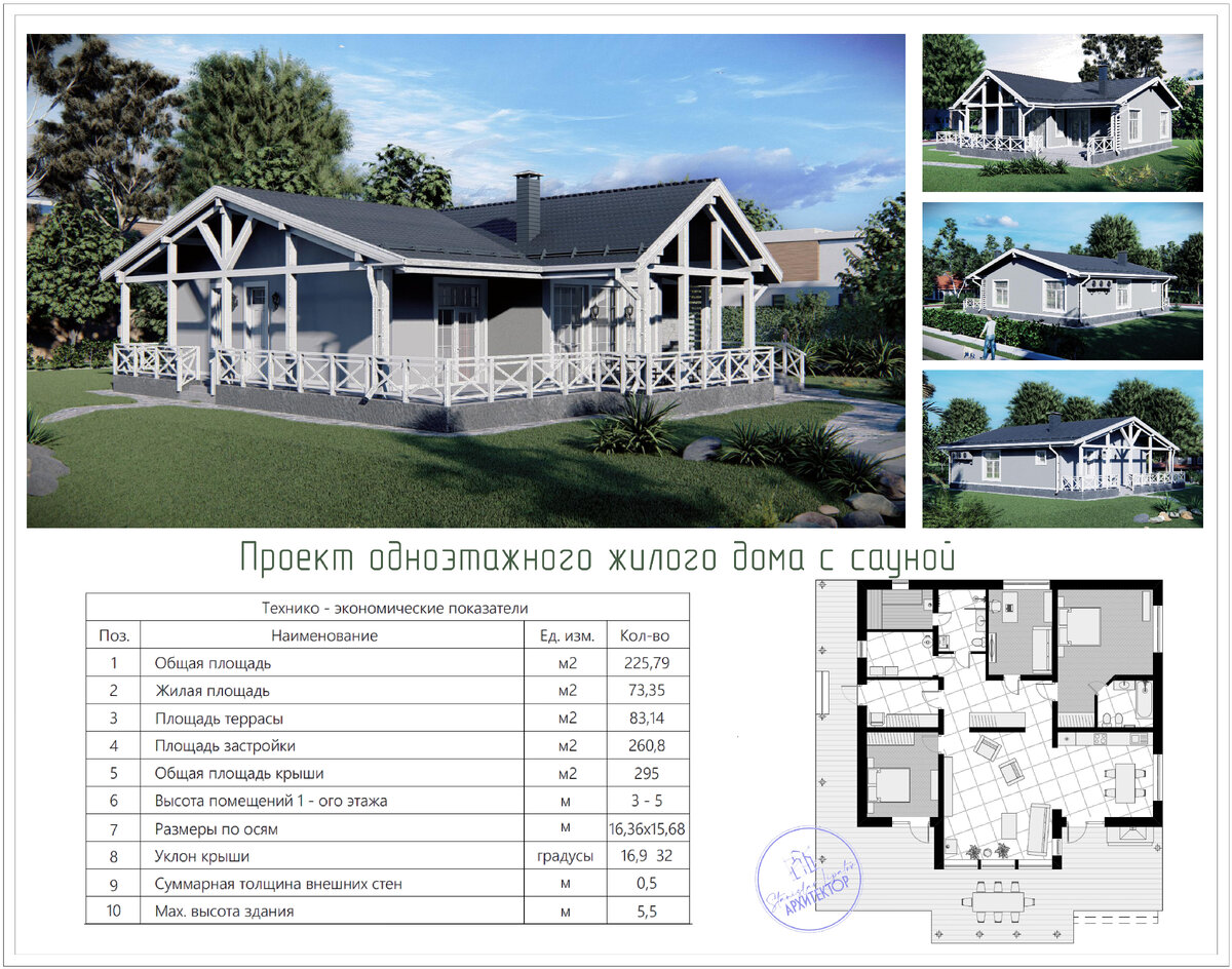 Данный проект разрабатывался на основе уже существующего фундамента с привязками канализационных закладных, поэтому, чисто субъективно, санузлы не удалось расположить так, как было бы совсем идеально. Но всё же планировка получилась весьма уравновешенной и эргономичной. В таком доме будем комфортно проживать гостеприимной семье из 3-5 человек. При составлении техзадания на проектирование заказчики решили пожертвовать гардеробной, но попросили обязательно сделать сауну. В итоге получился такой проект, с огромной модной сейчас террасой. Стоит отметить на террасе зону барбекю, для которой изначально заложены вытяжной дымоход. Так-же в гостиной будет сделан камин на дровах. Так-же изюминкой гостиной является огромное панорамное фасадное остекление. Его было решено сделать глухим, но для проветривания помещения в боковой стене спроектировано открывное окно. Гостиная и кухня не ограничены перекрытием и высота потолков там достигает 5 метров! В самом доме по помещениям следующий состав: прихо