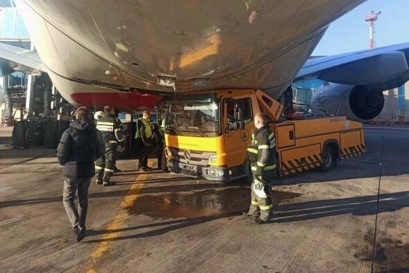 В Домодедове водовоз врезался в Airbus A380-800, стоимость которого составляет примерно полмиллиарда долларов. Водитель автомобиля перенёс инсульт прямо за рулём, его оперативно госпитализировали, а воздушное судно отправилось на ремонт.