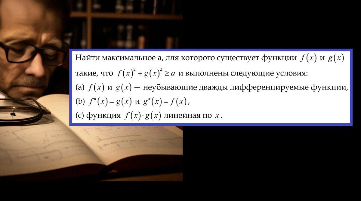 В этой заметке разберем подробное решение очень интересной задачи из функционального анализа. И это решение будет самым подробным в интернете. Задача была предложена одним из участников беседы сообщества Physics.Math.Code. Но, к сожалению, никто не предложил полноценного решения. У меня наконец-то дошли руки до разбора, поэтому давайте вспомним немного математического анализа и приступим 😊 А пока попрошу подписаться на мой канал в telegram IT mentor . Краткие заметки и наблюдения по физике, математике, программированию, железу и технике 💡 📝 А теперь к делу и к условию... 🕑 Задача Найти максимальное a, для которого существует функции f(x) и g(x) такие, что f²(x) + g²(x) ≥ a и выполнены следующие условия: