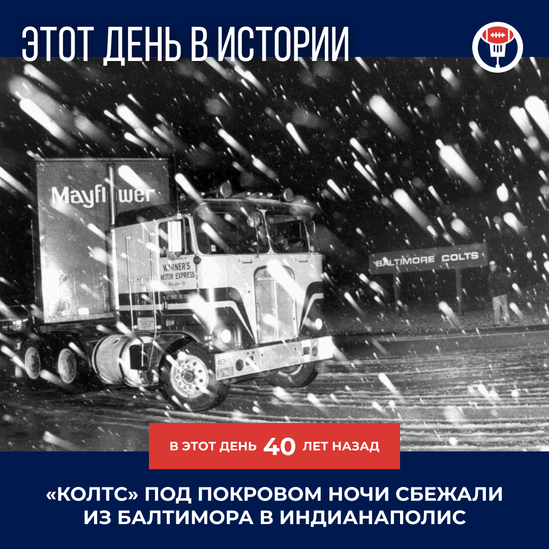 28 марта 1984 года всё имущество команды «Колтс» было в спешном порядке вывезено на 15 грузовиках из Балтимора в Индианаполис 🚛