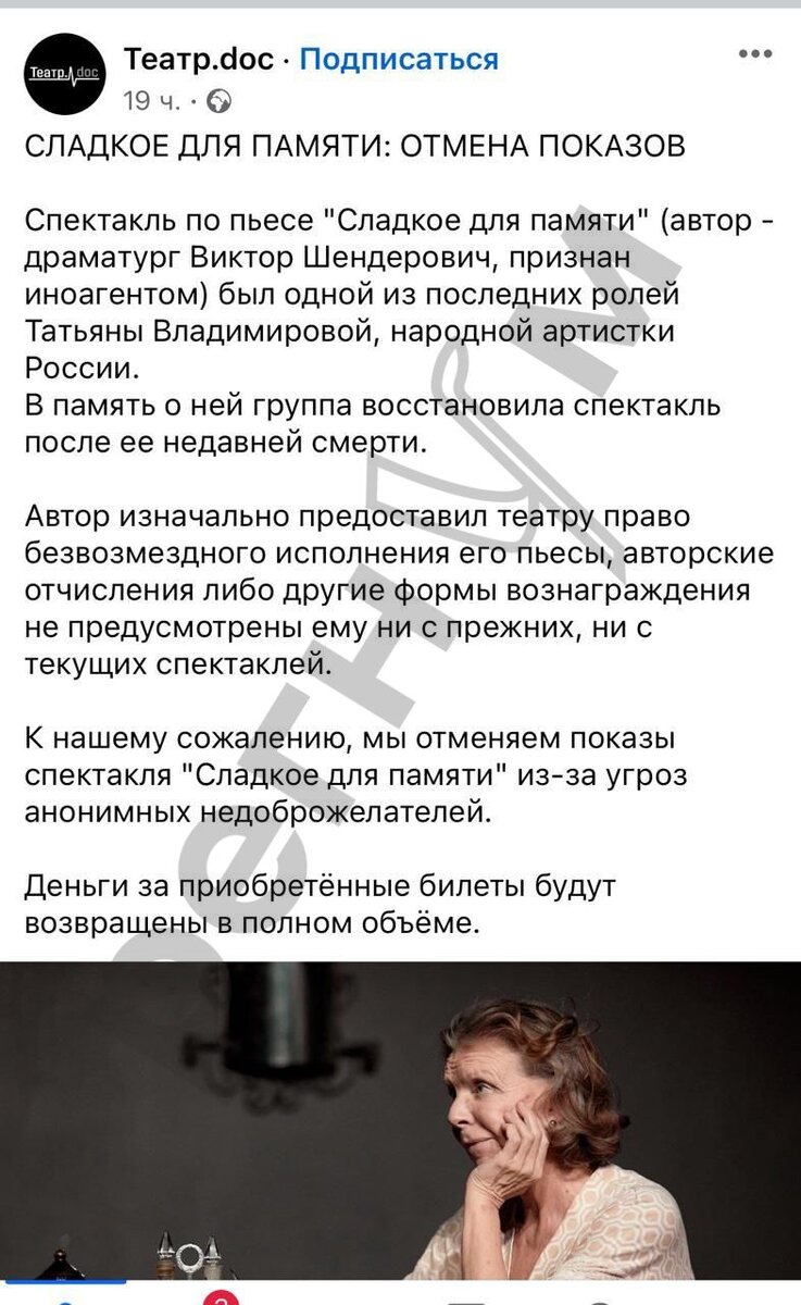 Деньги за приобретённые билеты будут возвращены в полном объёме," - написано на официальном сайте Театра.DOC, что арендует площадку в самом центре российской столице - на улице Лесная в районе Тверской. "Спектакли по моей пьесе "Сладкое для памяти", в театре DOC в Москве, отменены из-за вала анонимных угроз.