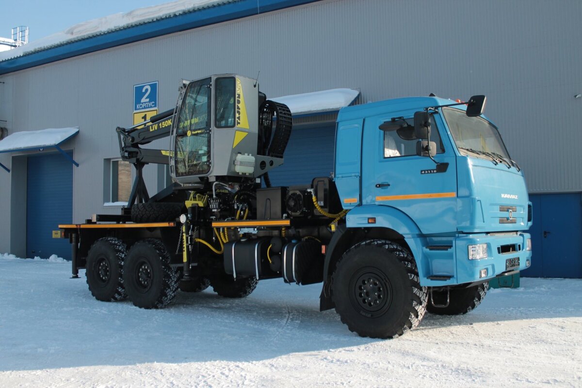 Перегружатель для леса на шасси КАМАЗ-43118 с гидроманипулятором Tajfun Liv L150K(96) с кабиной оператора (Словения).