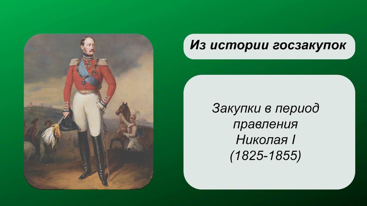 Император Николая I придерживался мнения, что сильное государство не может существовать без суровых законов и контроля населения. И это во многом отразилось на реформах и контрреформах, которые произошли в стране во время его правления. При Николае I завершилась «эпоха фаворитизма». Император плотно занялся борьбой с коррупцией. Это потребовало развития социальных и правовых отношений, техники, ведомственной структуры и, как следствие, совершенствования законодательства. Николай I видел в числе своих задач упорядочивание законодательства и восполнение его пробелов. В том числе это касалось и сферы госзакупок. Как можно классифицировать торги того времени Торги с неограниченной конкуренцией не имели законодательного стержня. Итоги могли оспариваться, ведь во все правила выигрыша закладывался принцип предложения наименьшей цены. Подрядчик получал искусственно пониженную плату. Это неизбежно вело к ухудшению качества товаров. Механизм был далёк от идеала, в итоге некоторые ведомства занял