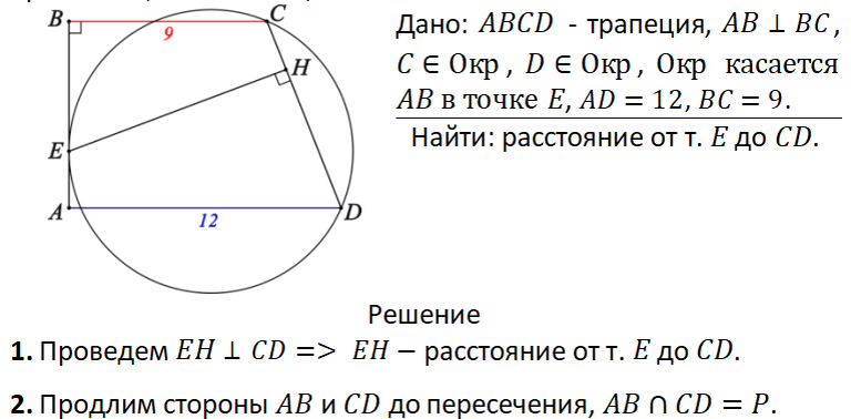 ОГЭ 2024. Математика. 38 вариантов. Типовые варианты экзаменационных заданий. Под редакцией И.В. Ященко Задание 25 Вариант 7 В трапеции ABCD боковая сторона AB перпендикулярна основанию BC. Окружность проходит через точки C и D и касается прямой AB в точке E. Найдите расстояние от точки E до прямой CD, если AD=12, BC=9. Чтобы не пропустить публикации решений других задач №25 из ОГЭ по математике 2024, пожалуйста, подпишитесь.